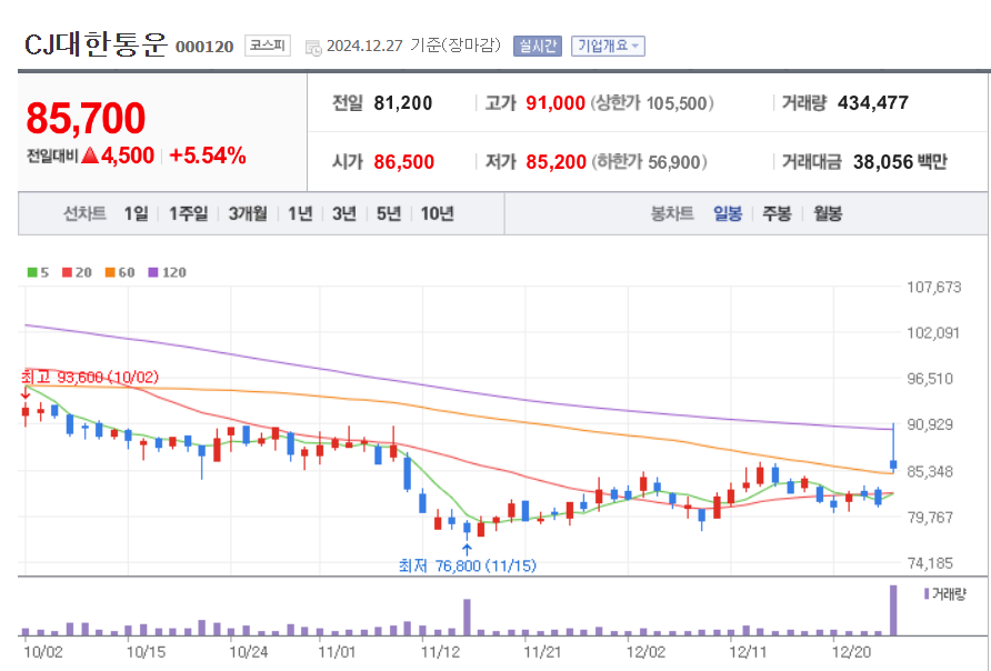 작성일 기준인 2024년 12월 27일, CJ대한통운의 주가는 전일 대비 5.54% 상승한 85,700원에 거래를 마쳤습니다.