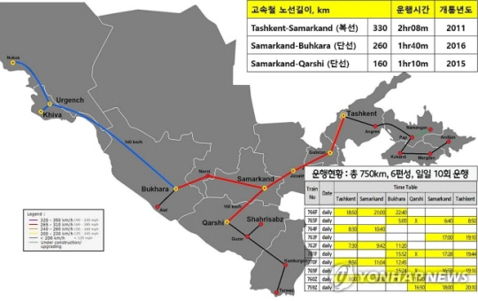 타슈켄트~부하라, 부하라~히바, 미스켄~누쿠스 등 총 1216㎞에 달하는 노선에 투입될 예정입니다.